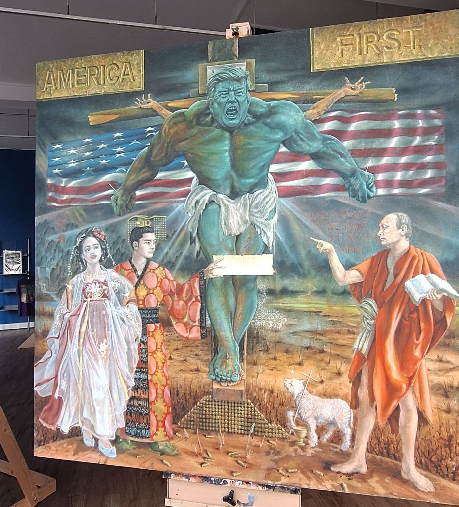 I really didn’t need to see this portrait in the window of a ground floor unit of Great Northern Warehouse. Entitled America First – Trump, Putin, China, by local artist Michael Browne, it is hard to miss as you walk by, quite disturbing.
