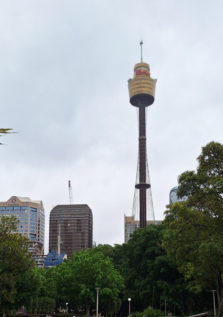 Look at the glorious blue sky. Well, not today! And note the 56 external cables wrapped around the body of Sydney Tower to prevent swaying during high winds. Very hard to count from this distance.