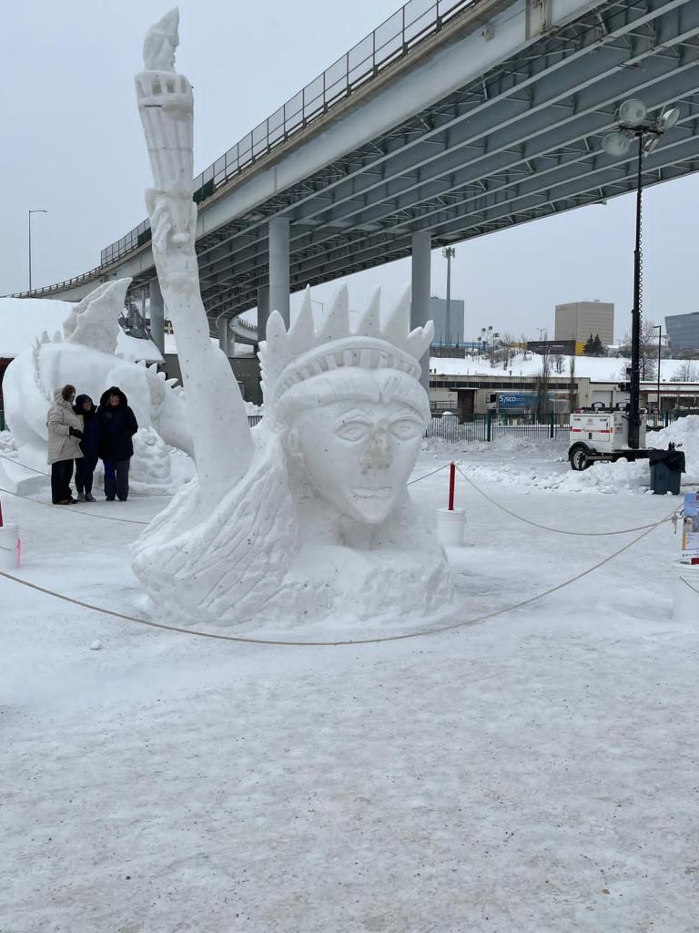 The Statue of Liberty was created by Steve Lukshin and won first place in the solo division of the Alaska State Snow Sculpture Championship. Who knew there was such a thing?