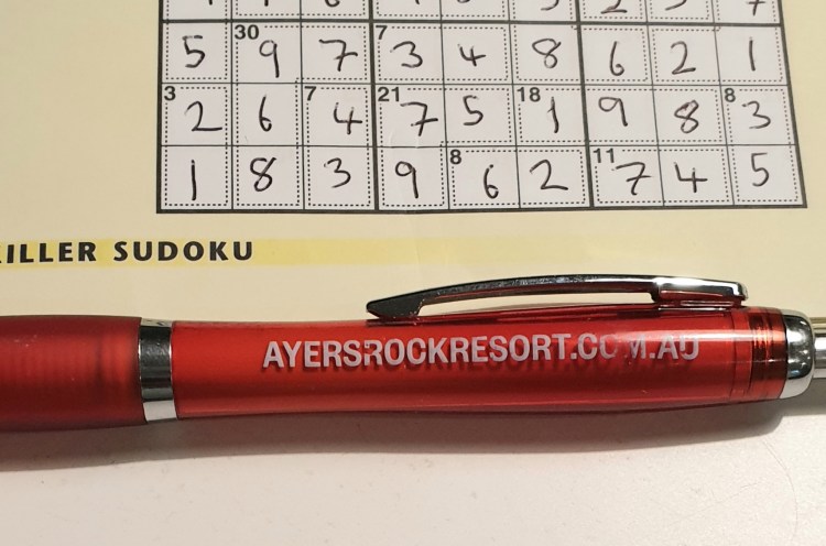 Sorry to share some sad news. Last year, I acquired a pen at Ayers Rock Resort in Australia. It became my favourite biro, providing a very satisfying, smooth writing experience. A few nights ago, mid Killer Sudoku, it died. It ran out of ink. Its natural bodily juices are no more.