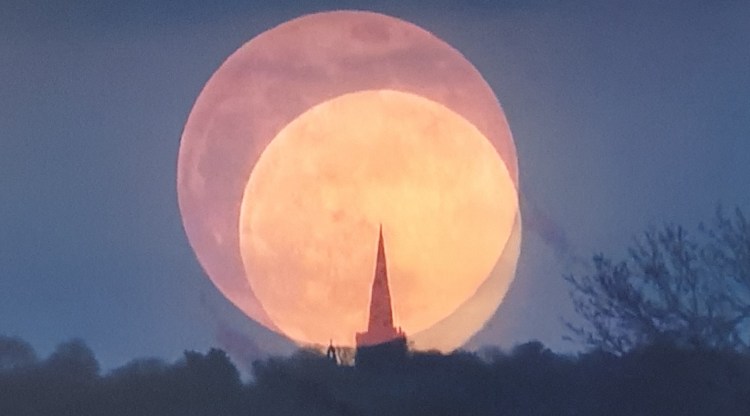 But if we couldn’t celebrate Martha’s big day properly, the wider universe did. It chose tonight to reveal the year’s biggest full Moon, a Supermoon, a Pink Moon: the Moon very nearly at its closest to the Earth, appearing 14% larger than usual. It would have been a terrific sight if it wasn’t for the clouds that appeared during the course of the evening. Other people managed to get some decent photos though so I captured this one from TV the next day.