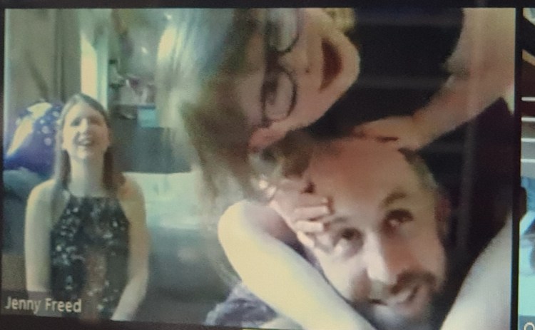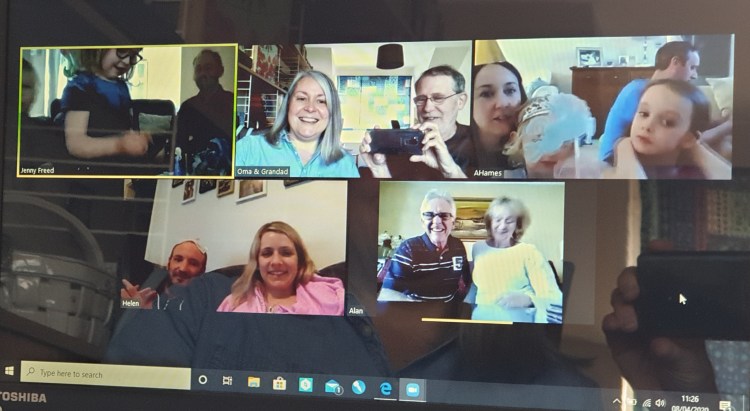 Zoom with: part of William, Martha and Liam; Liesel and Mick; Andrea, Emily and Paul; Adam and Helen in Australia; Alan and UnaJenny and Birthday Girl balancing on Daddy’s headThe big 4