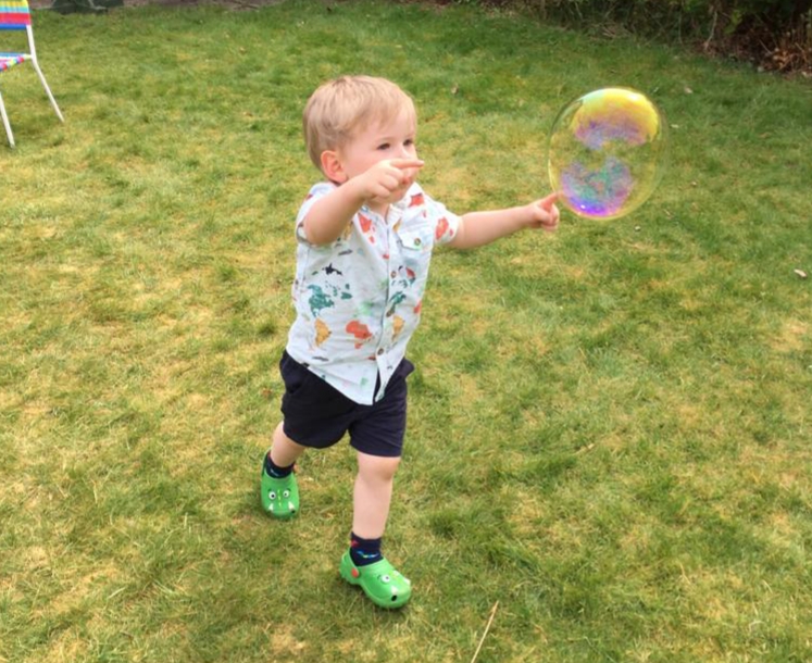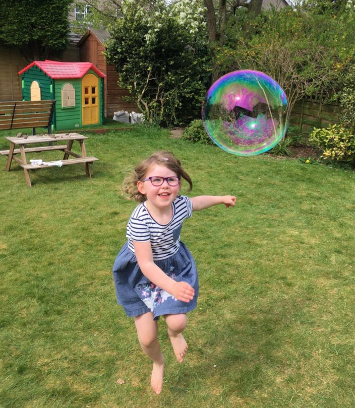 Martha floating after a bubbleWilliam chasing a bubble