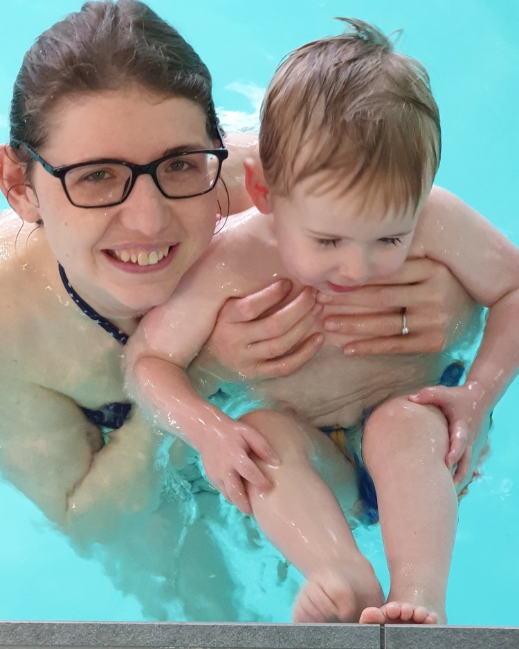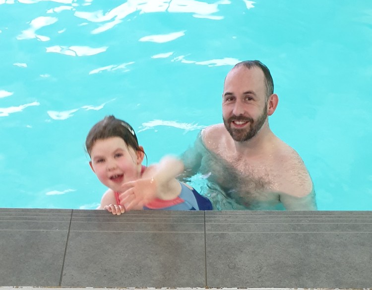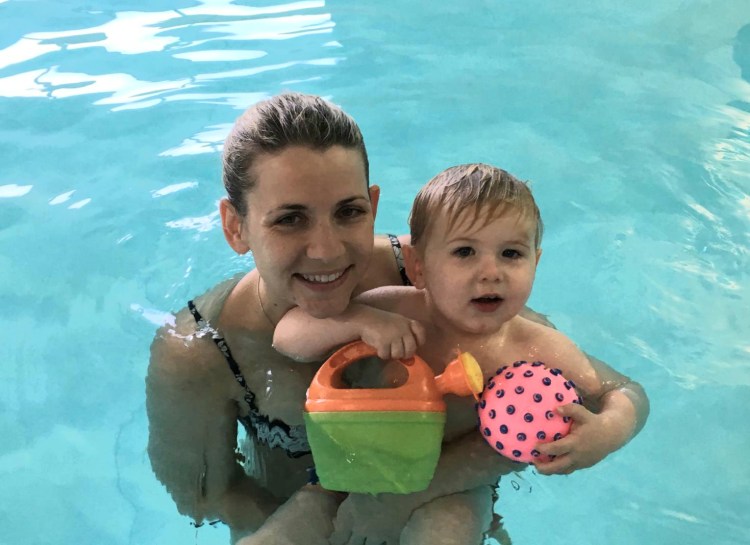 Pictures of parents in the pool with their children always cheer us up, so here are a couple. And, as a bonus, they are people we actually know.