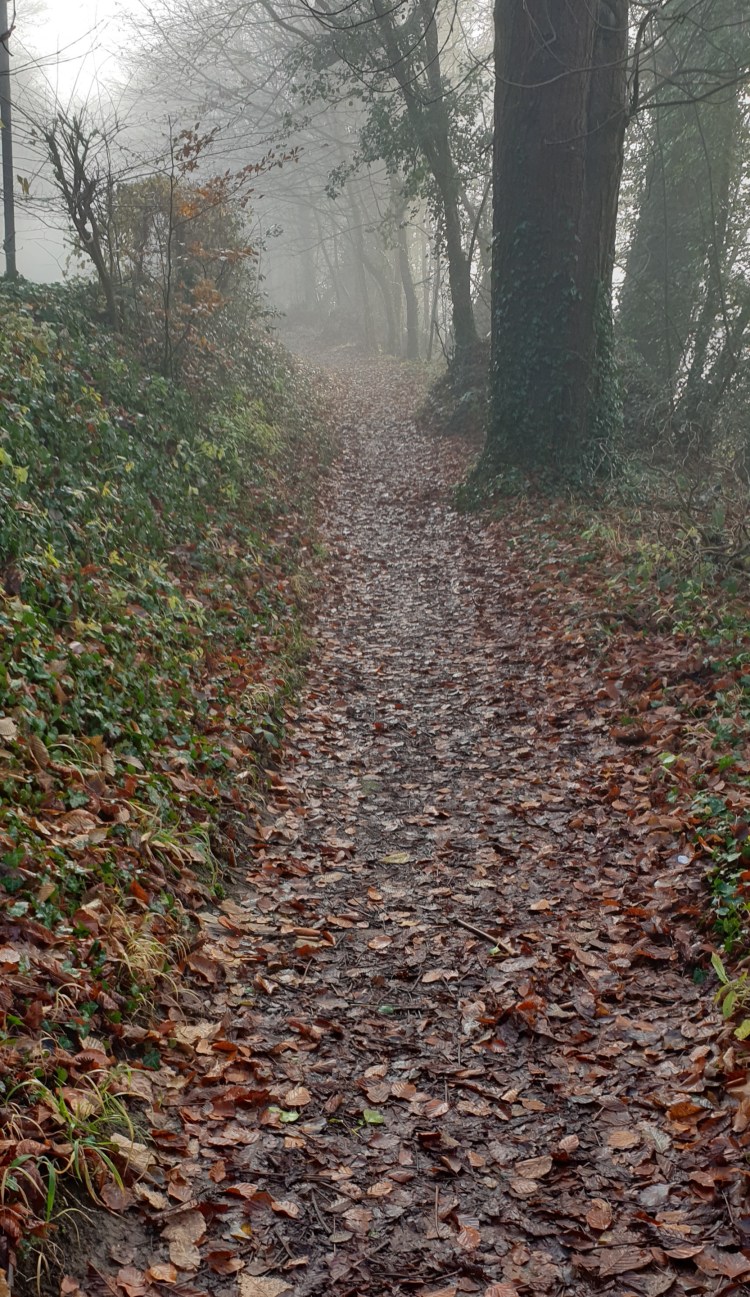 Liesel had planned to meet up with another old friend, Chris, in Dorking, and I was expelled from the car at the Mickleham turning off the A24. It was a bit cold and frosty and misty today, ideal for a spot of mountaineering. For the first time ever, I was going to scale Box Hill on foot.