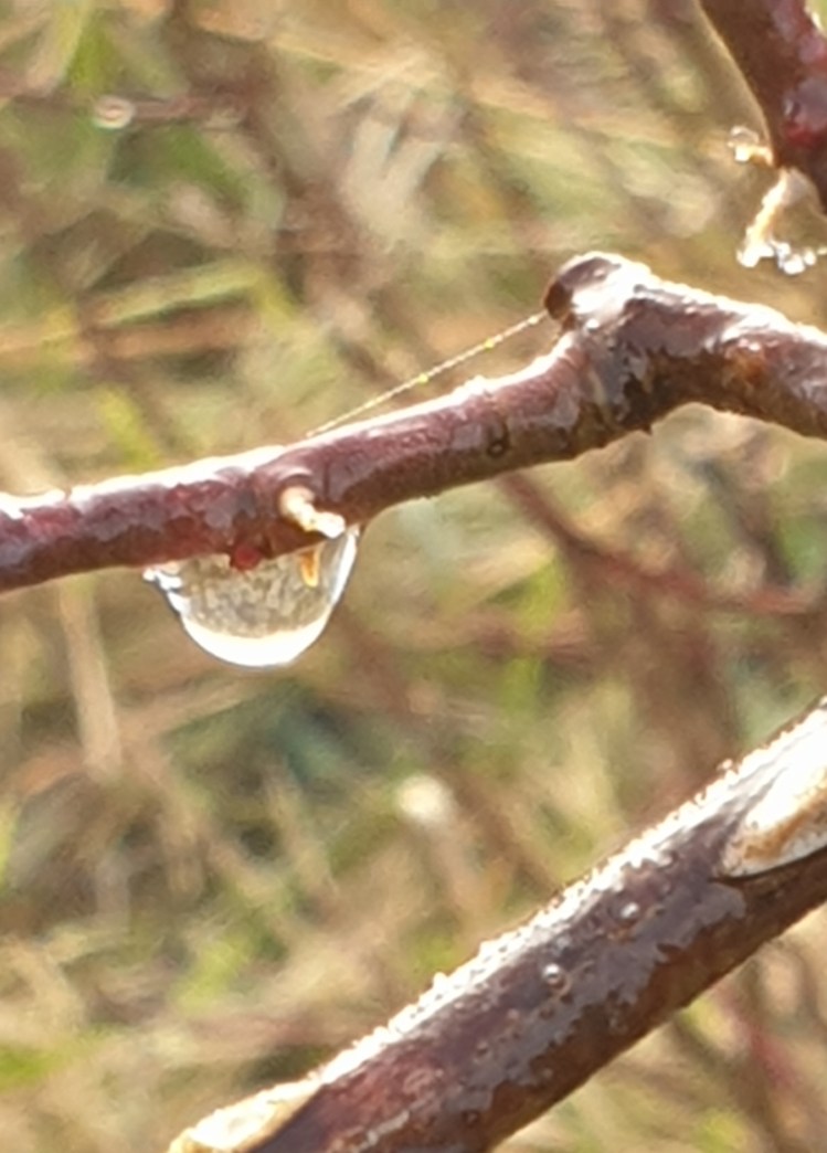 I had a beany hat on to protect the lugs but despite the mist and the frost, the exercise was keeping me warm. The dripping water was not rain but melting ice, also looking glorious.