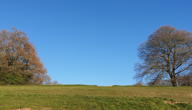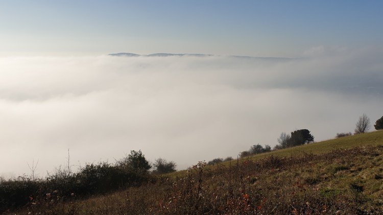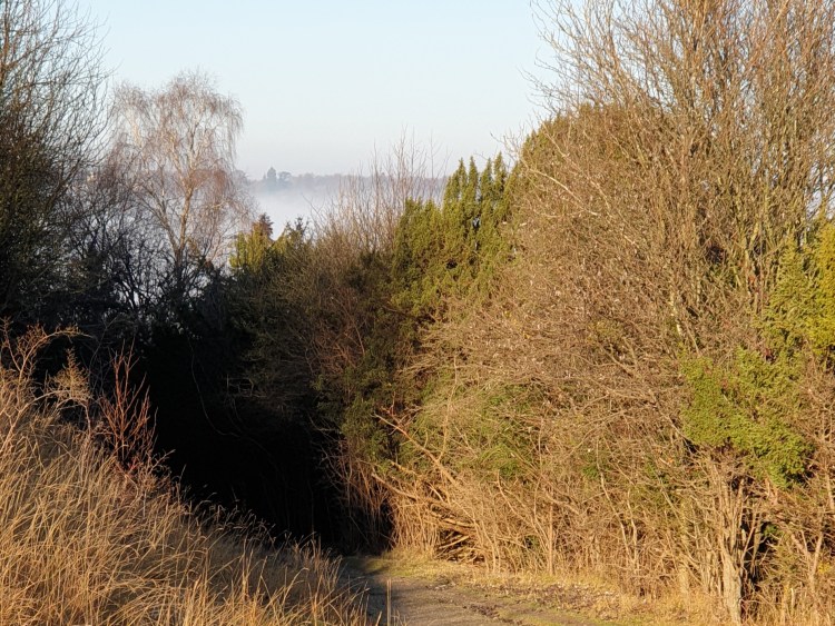 Usually you can look out over the valley below, admire the fields, compare the people with ants and literally look down on Dorking. Not today. Pearlescent cloud filled the valley. In the distance, Leith Hill peeked out.