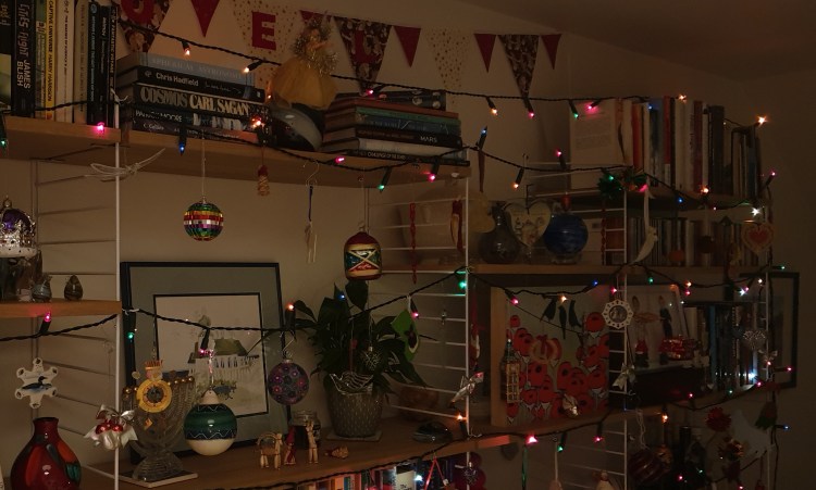 We decided not to try and squeeze a Christmas tree into our apartment this year. Instead, we (Liesel) decorated the shelves with lights and ornaments and it looks terrific.