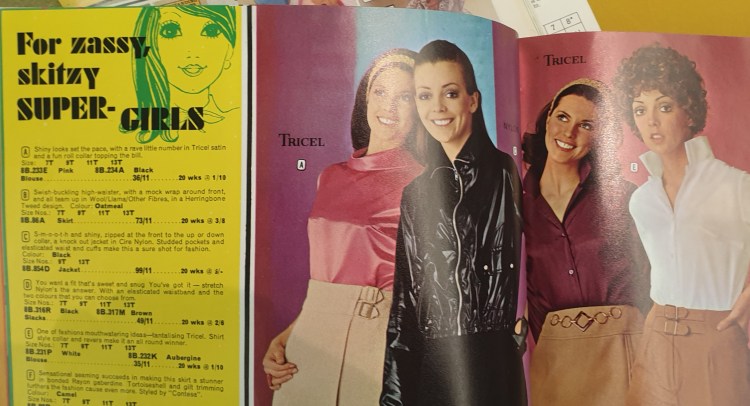 Who could resist a shiny pink blouse for 36/11d? Well, I did, and I’m sure my Mum did, too, although she did use this catalogue on a regular basis. Maybe my Mum didn’t think she was zassy or skitzy enough, but she was definitely a super-girl.