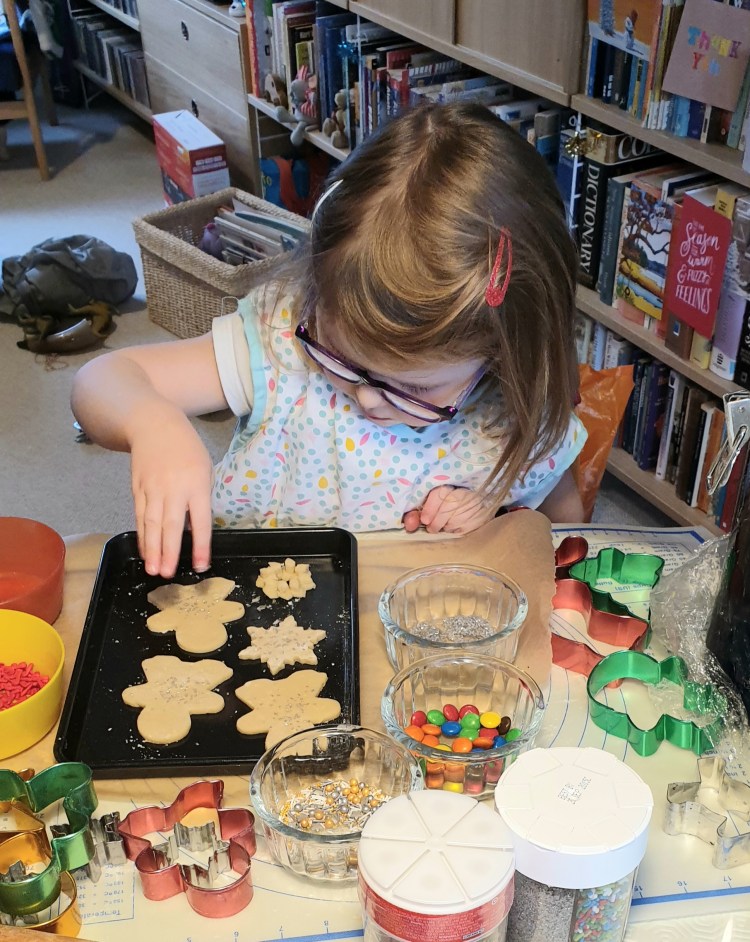 Next day, it was Martha’s turn to bake the cookies. After watching William for a short time while Martha performed in the Nativity play at Nursery, “Gold for the baby”, we brought her round to our place. She made a whole tin of cookies and didn’t eat as many as I did.
