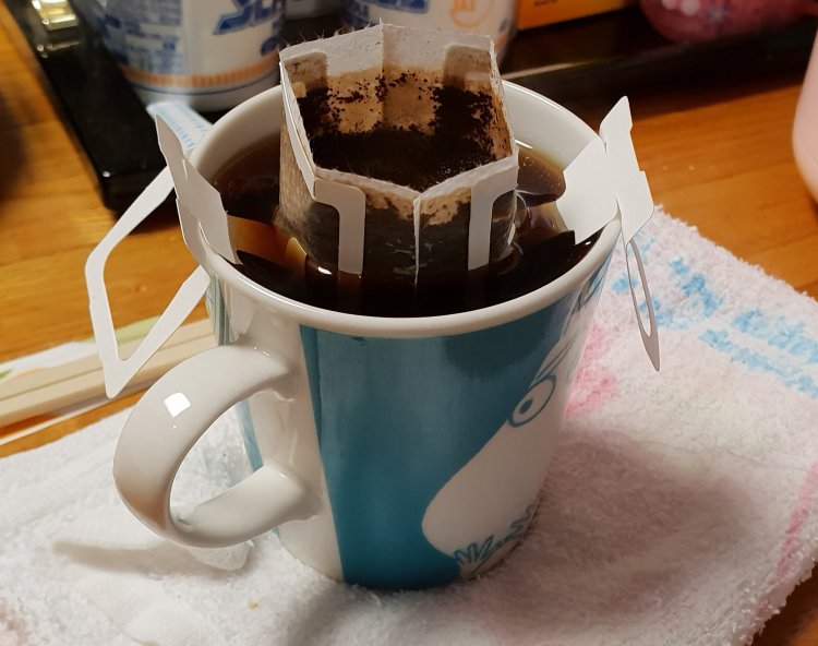 I was very glad that I spent much of my youth practicing the fine art of origami. A passing knowledge is required if you want to make filter coffee. The thin cardboard handles unfold so the filter bag hangs into the cup.