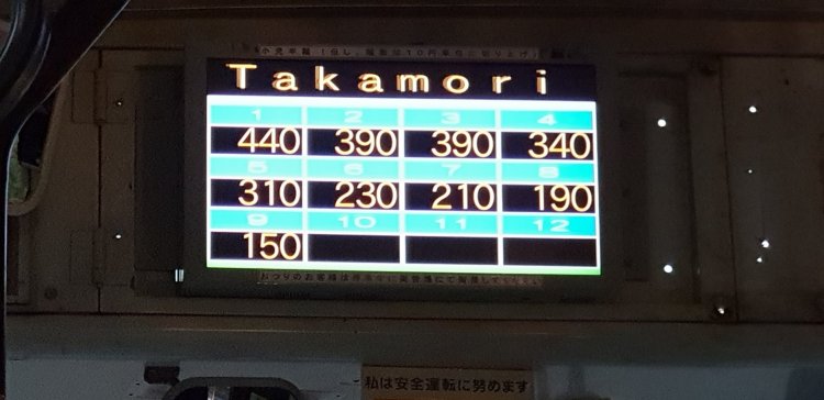 Your ticket has a number on it, such as 3 or maybe 6, and this number corresponds with the numbers on the displayed grid. Each number has an amount underneath which represents the fare you would pay if you were to get off at the next stop. But if you stay on the bus, you’ll see the amount increase underneath your number and thus, if you were counting out the money so that you could tender the exact fare, you would have to recalculate. It’s like watching the fare in a taxi go up and up at a ridiculous rate, only there are six such numbers. Well, six for a while, then, as the journey progresses, it turns into a 3×4 grid, that is to say, there are now 12 possible different fares for people to pay, if they each joined the bus at a different location and thus received a ticket with a different number from each other. And the fares don’t go up by fixed amounts, either, oh no, sometimes the increase is 30, sometimes 50 yen and occasionally there are other odd increments. Sometimes two adjacent numbers might incur the same fare for a short while. But there is plenty of time in which to count out the coins so that you can get rid of as many as possible, thus reducing the weight of money in your pocket. You want it to be correct. So when the time comes and you’ve arrived at your destination, you stand up, walk to the front, try to hand the driver the correct fare. But no. There’s a plastic box there into which you drop the coins along with the ticket. Inside this box, there is a slow-moving conveyor belt taking the takings to, presumably, some sort of counting and checking device. But that doesn’t matter because, as I said, the conveyor belt moves quite slowly, so by the time it’s sucked in your final coin and your ticket, you are well away from the bus.