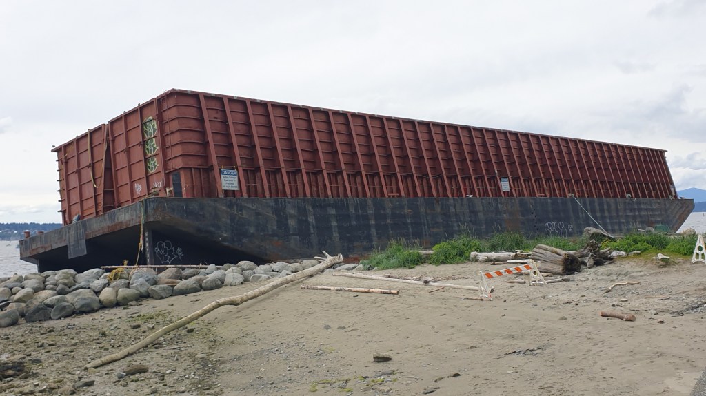 I’m glad I wasn’t piloting this barge on the night of the storm that beached it. What an eyesore on English Bay Beach. Maybe it will be truned into a restaurant or something eventually. Attempts to shift it, even at very high tide, have failed.