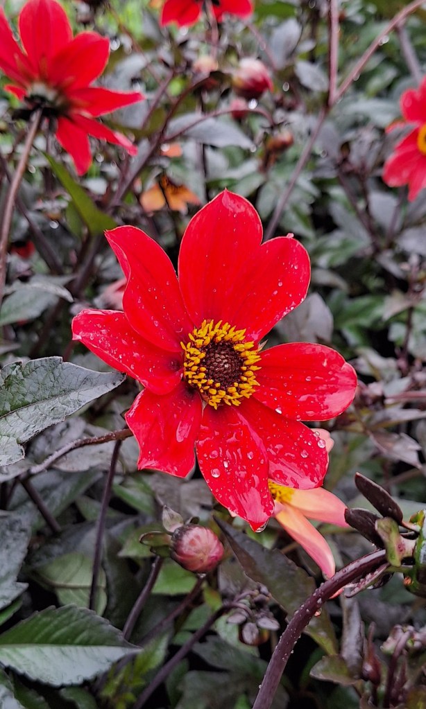 The dahlias looked good in the rain, and what a coincidence: I just started reading a PG Wodehouse book in which Bertie Wooster’s Aunt Dahlia looms large.
