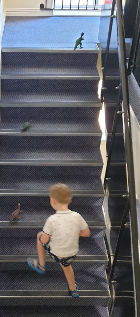 We walked back home a slightly longer way because we had errands to run. In Marie Louise Gardens, we collected a bag of sticks and fir cones. This is for a future project in which Liesel will construct some bug hotels with the ladies of the WI. We had some items to buy at the Co-op, and I let Liesel have the pleasure of going inside, masked of course. But most importantly, we collected a parcel from the Post Office, 3 kg of plastic dinosaurs, newly arrived from Liesel’s Mom in Alaska. And as someone suggested on Twitter, plastic dinosaurs are the most realistic replicas possible. Plastic comes from oil. Oil comes from dead, squished dinosaurs. So a plastic dino might easily contain some genuine dino DNA. We could in theory create our own Jurassic Park. We didn’t do that though, oh no. Instead, the following morning we left a trail of dinosaurs up the stairs and leading to our luxury apartment. From above, I watched William as he spotted one. Then another… Then another…