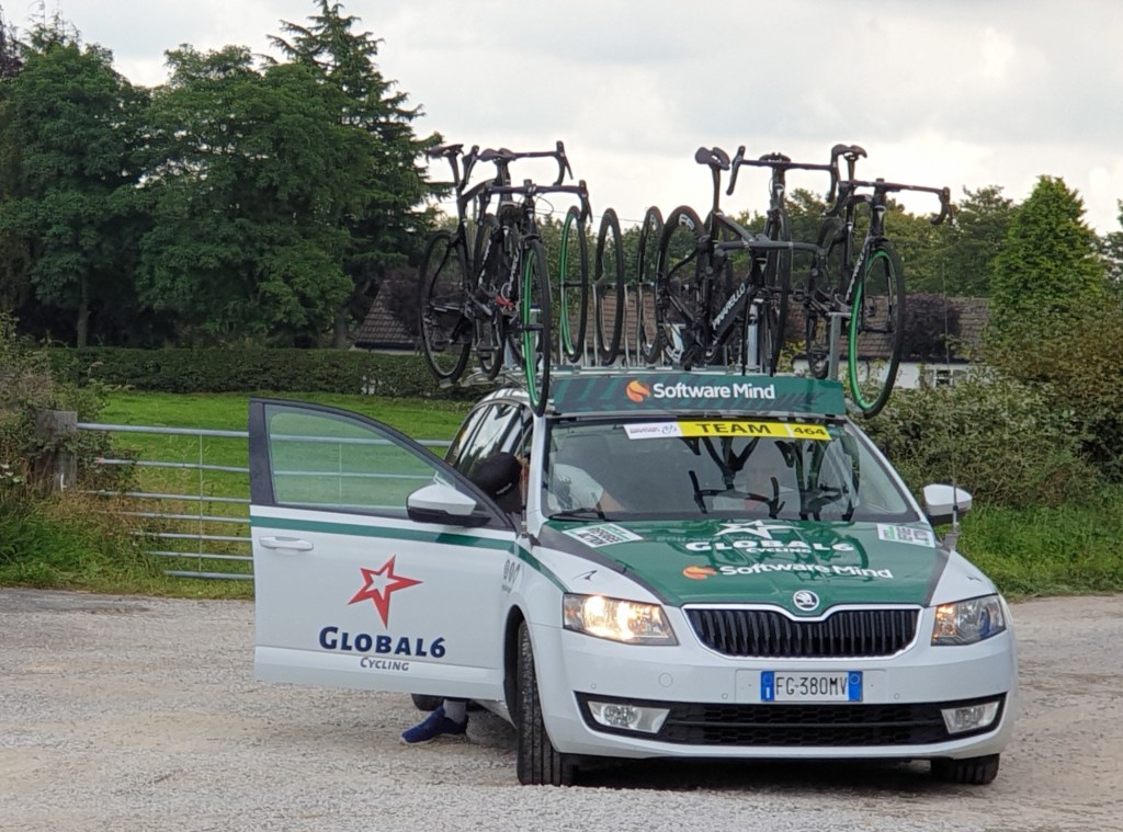The Global6 support team parked up near us, for a natural break. Their bike wheels have green rims, and after the Tour is over, those wheels will be auctioned off to raise funds for Refugee Action.
