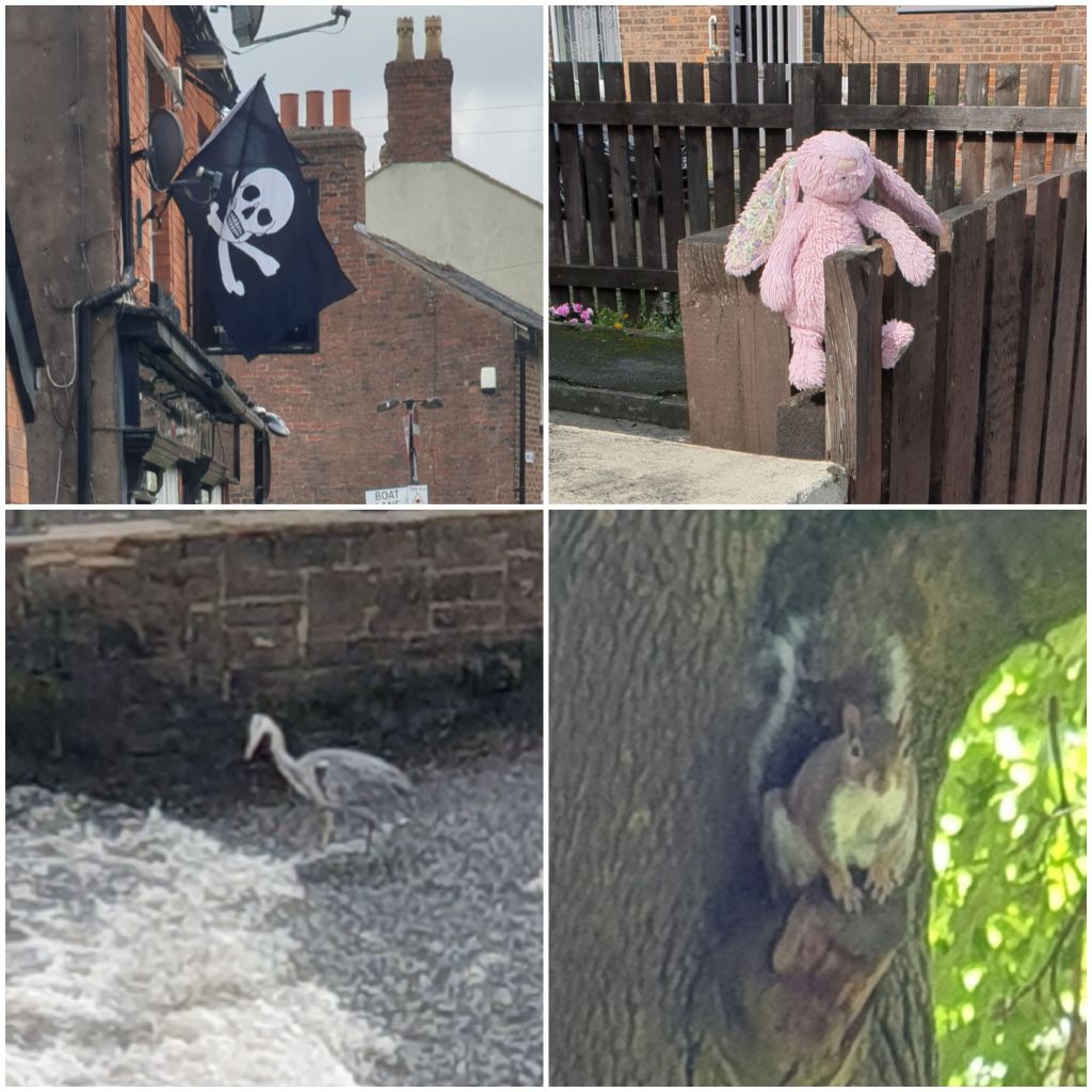 The Jolly Roger is still flying at The Crown for the boat race a couple of weeks ago. I hope the pink bunny is soon reunited with her child. The squirrel posed beautifully. The heron was in its usual spot and he seemed to be finding things to eat in the very low river.