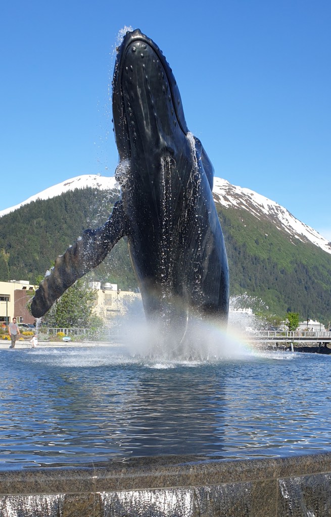 Back in Juneau, we rested by the whale fountain for a while. I noticed how prickly the grass was, but maybe it’s for walking on, not lying on.