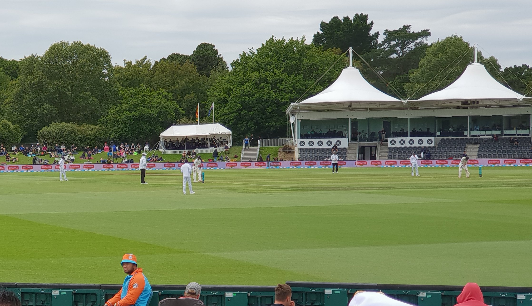 I couldn’t believe the number of adverts. There are TV screens along the whole boundary, the boundary itself is an ad for a bank. There are even big TV screens in front of the sight-screens. When the batsman requests it, big curtains are drawn in front of these displays. After an hour of play, the players stopped for a refreshing drink of Powerade or something equally vile, according to the announcer.