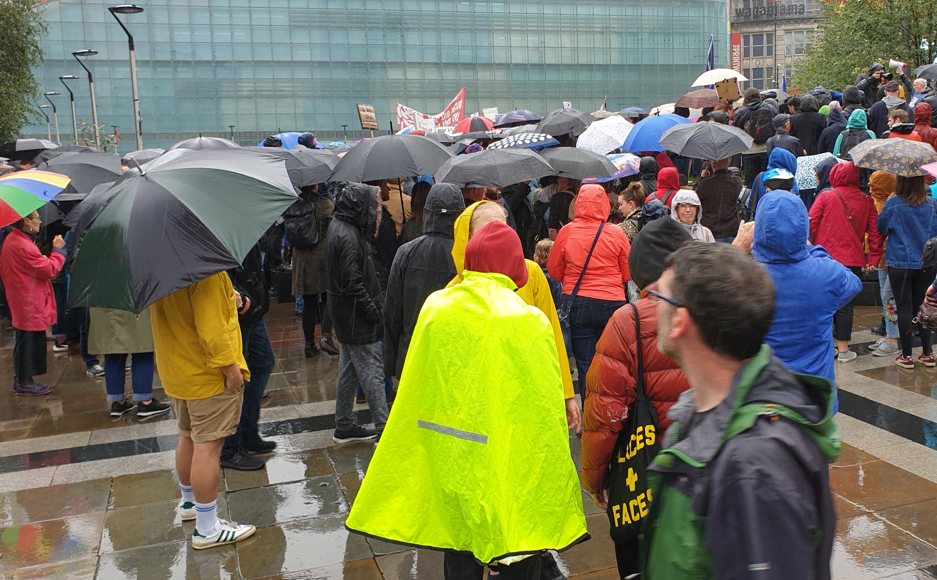The rain began to ease off so I donned a hat and jacket and continued my walk towards Cathedral Gardens. This was the focal point of todays protest against Boris Johnson’s unprecedented long prorogation of parliament. There were all sorts of people here, labour supporters and tories, leavers and remainers, all incensed at the erosion of democracy in our country.