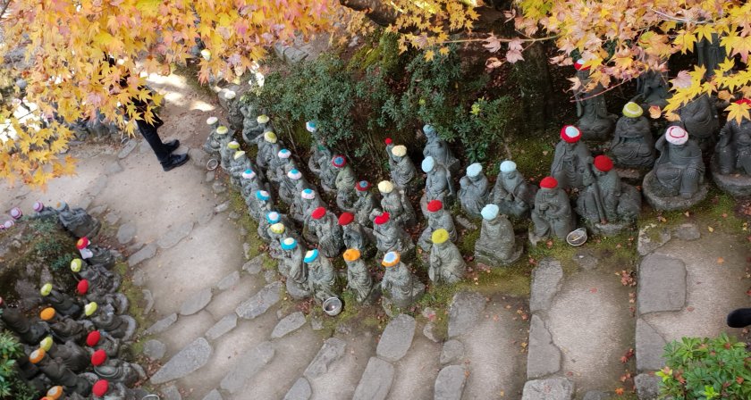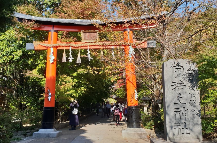 Of course, you can’t visit a Shinto Shrine without visiting a nearby Buddhist Temple. As a bonus for us, this was a special day.The “Hiwatari-shiki” is sponsored by the Daisho-in Temple and takes place twice a year on April and November 15th. This is a religious rite performed by the Shingon Sect of Buddhism. We wondered what the queue was for, especially as most, not all, had taken their shoes off.