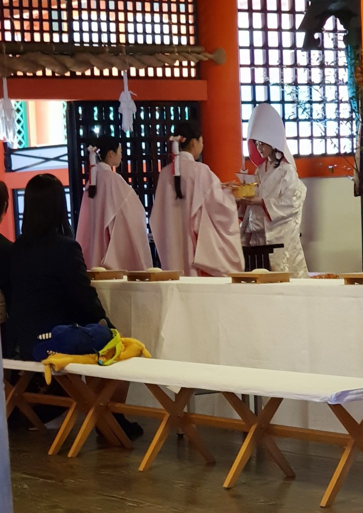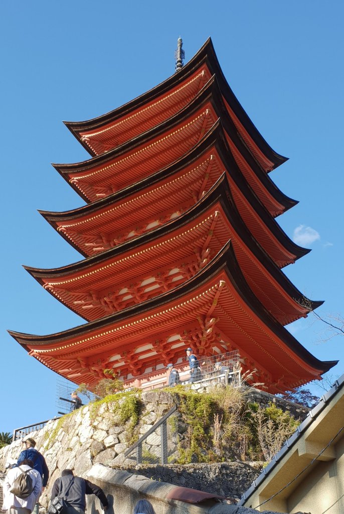 The Itsukushima Shrine was first built in 593. Yes, 593 and then remodelled in 1168. There was a heron trying and failing to catch the little fishes that lived in the pools left behind by the ebbing tide. I don’t think this was menat to be the main entertainment. That honour goes to the wedding that we, and many, many other people witnessed as we walked by. The flute quartet played some interesting traditional Japanese music.