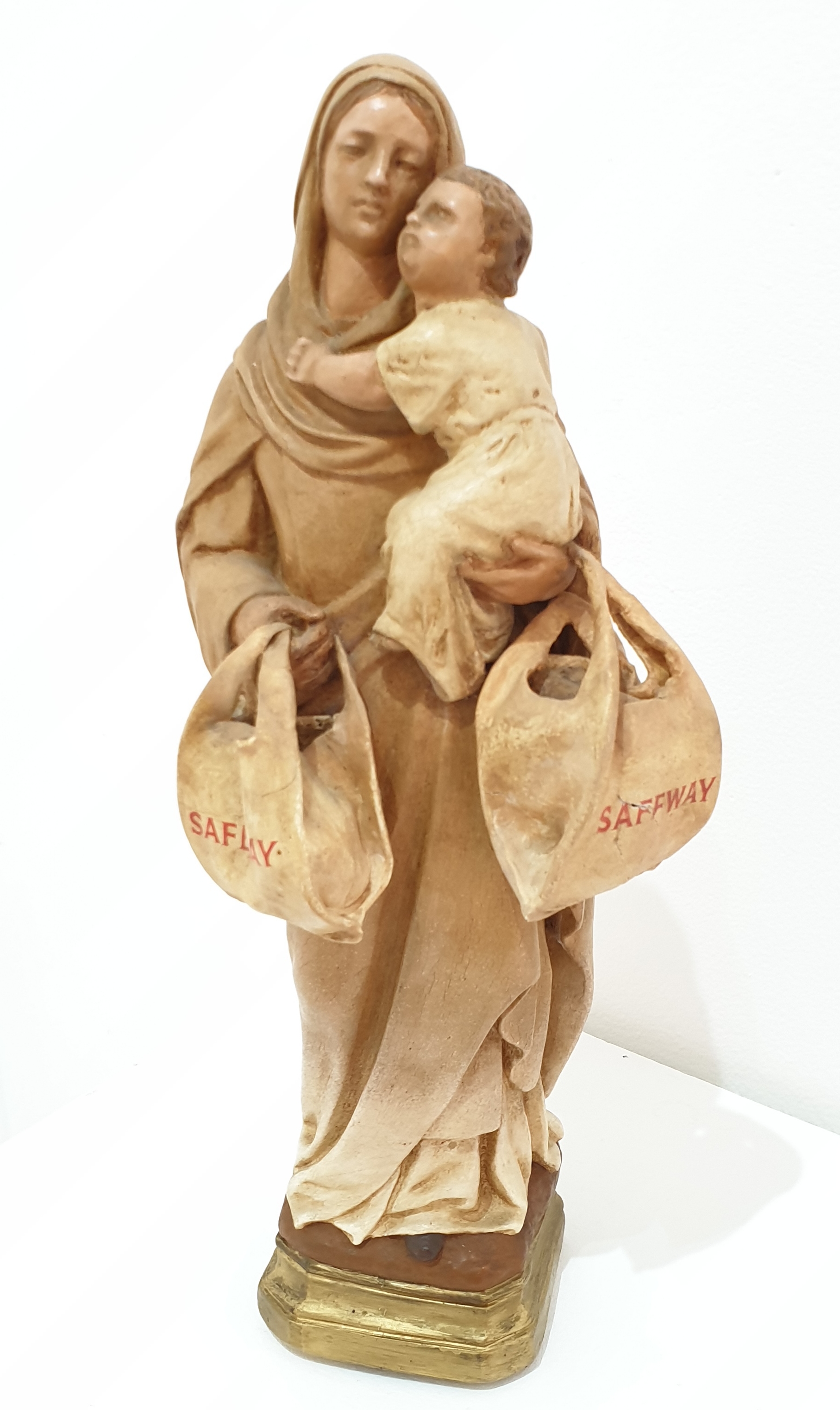 From Wikipedia: [On the fourth plinth, there is a] recreation of a sculpture of a lamassu (a winged bull and protective deity) that stood at the entrance to Nergal Gate of Nineveh from 700 B.C. It was destroyed in 2015 by Isis, along with other artefacts in the Mosul Museum. [Michael] Rakowitz’s recreation is made of empty Iraqi date syrup cans, representing the destruction of the country’s date industry.