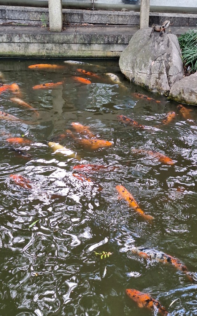 The koi carp in the pond were immensely jealous of the attention given by visitors to the many lizards on the paths and rocks.