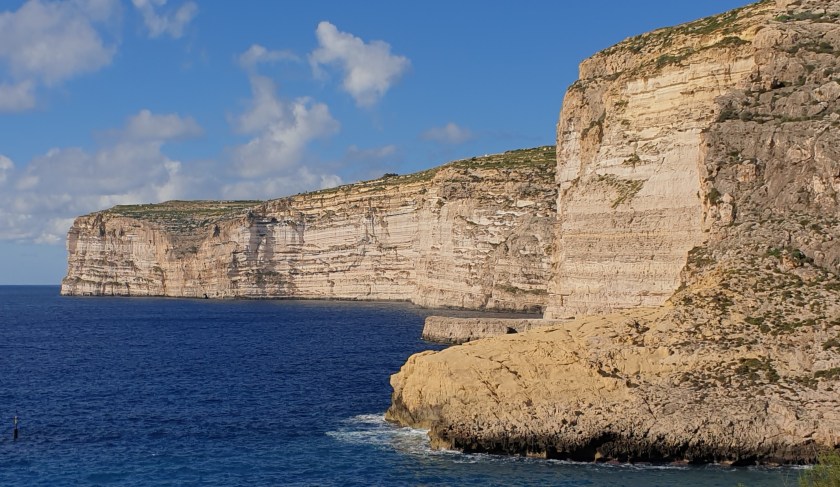 The weather hadn’t been as bad as forecast and the following day was even better. So we headed south on this occasion, to Xlendi. The walk, nay, hike, along the coastal path was more challenging than the average stroll around Northenden, that’s for sure, and in a couple of places, we lost the path. Still, no sheep nor goats to worry about.