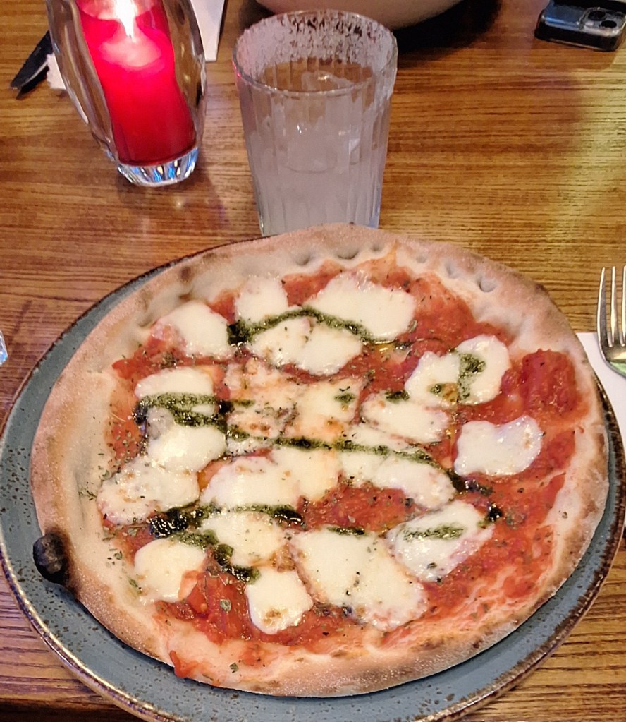 Before the show, we had to eat. Our first choice of eaterie could let us have a table, but we wouldn’t be able to order food for 45 minutes. So we went over the road to HOME, where for the second time ever, I had a margherita and a margarita together.