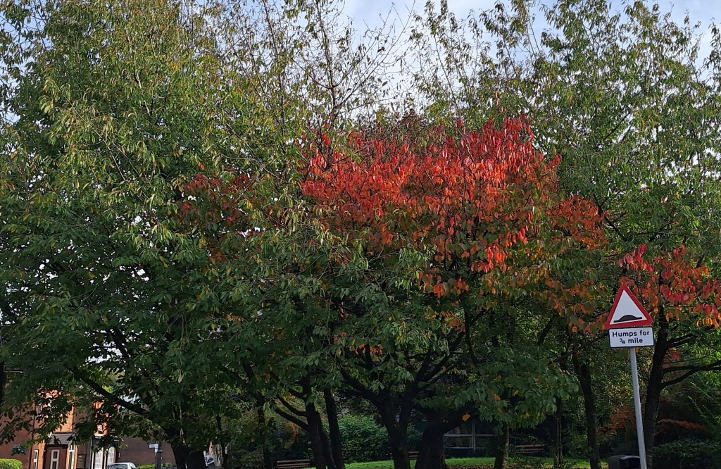 There is a splash of Autumnal colour in and around Northenden, as I saw on my first walk up to the coffee bar. Well, there was no milk in the house, that’s my excuse. Groceries were delivered later in the day.