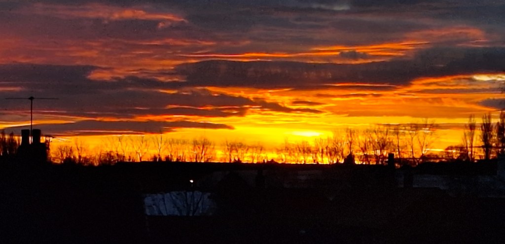 We enjoyed another wonderful Northenden sunset, not all the colours of the rainbow, but at least one of them.