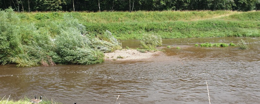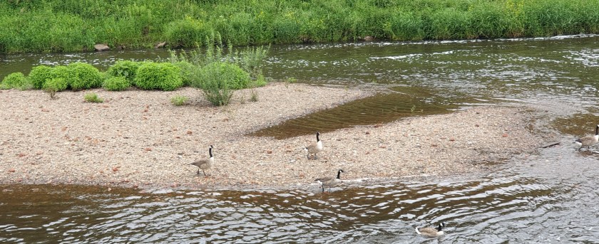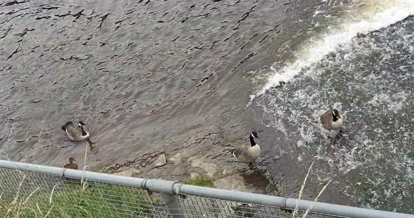 My phone installed a new update this week and I didn’t realise at the time, but some of its operations have changed. That is the reason I have no footage of the geese having a good time. One was walking up the weir then sliding down on his belly. I filmed him a couple of times. Except I didn’t. But I do have some mad footage of me moving about in between those attempts, featuring some nice shots of my shoes and the grass and the sky.