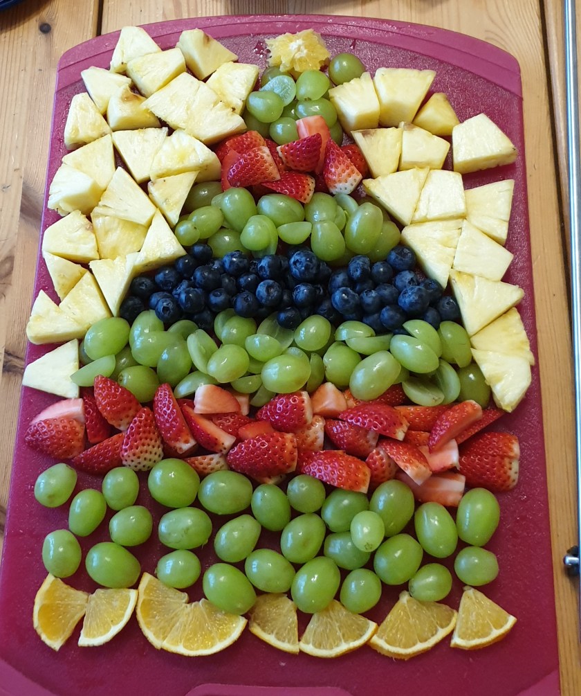 Christmas Day, we visited the grandchildren of course, bearing gifts and food. Liesel was very busy in the kitchen, baking cinnamon rolls and scones, building a Christmas tree from fruit, making American-style fudge.