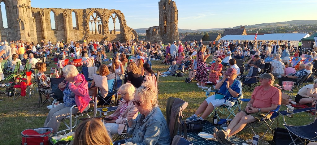 And so to the 199 steps. After an early dinner in our Airbnb (not really a b&b), we made our way up them for the main reason we’d visited Whitby this weekend. Proms in the Park, in the grounds of Whitby Abbey. The audience sat on their own chairs or blankets, and enjoyed the own picnics or some of the food on offer. I had a really big chip butty: well, we were up north.