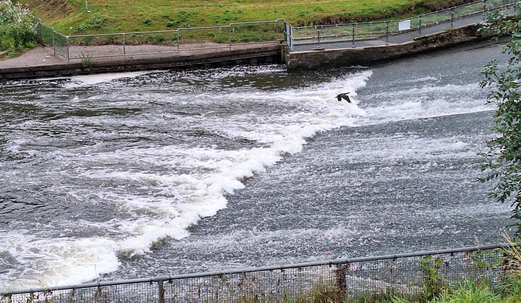 Liesel, Leslie and I went for a walk to the Co-op, via the river and the weir. On the island, a shag or a cormorant was playing with me. He’d had his wings out to dry, and every time I thought about taking a picture, he’d put them down again. I’ll make a video then, and screendump one of its frames. It knew, it knew. It did not cooperate. Instead, it decided to fly off somewhere, probably to tease other potential photographers.
